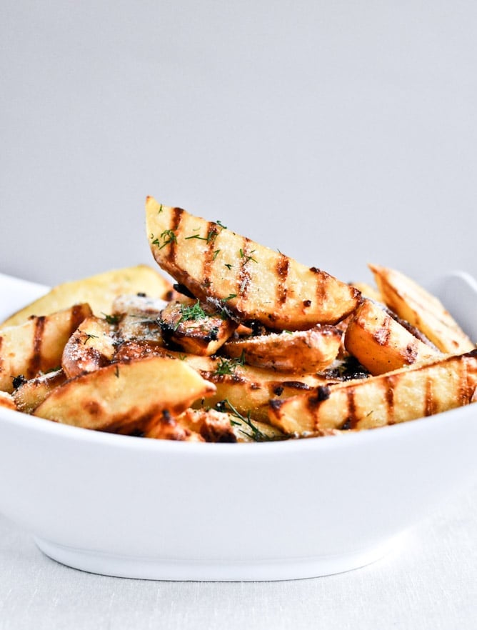 Bake for 20 minutes, flipping and tossing once, then for 15-20 minutes more, until golden and crispy. Remove and immediately toss with remaining sour cream and onion mix, and even more fresh dill. Serve immediately!