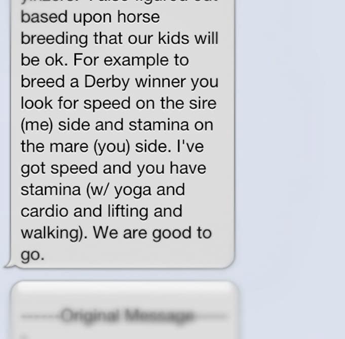 6. When my husband is stuck on airplanes with no place to go, he sends me texts like this pertaining to our future. Apparently when it comes time to have kids, things will be fiiiiine according to Kentucky Derby breeding standards.