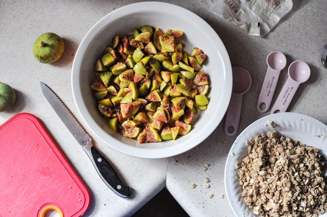 - Preheat oven to 375 degrees F. Add figs to a baking dish (I used a 9-inch pie plate) and sprinkling with brown sugar, salt and cinnamon, then toss to coat. Set aside.