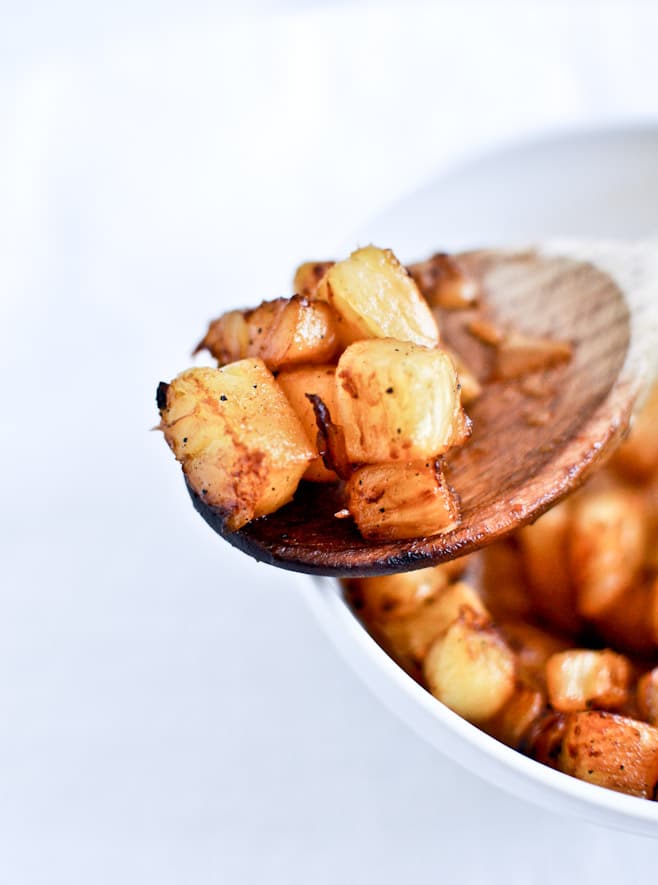 - Heat a large skillet over medium heat and add 1 tablespoon of coconut oil. Add pineapple and toss with salt and cinnamon, cooking until caramelized and golden, flipping occasionally – about 6-8 minutes. Remove pineapple and place in a bowl, then add another 1/2 teaspoon of coconut oil, tossing in onions and peppers with a pinch of salt. Stir and cook until softened, about 3-5 minutes, then remove from the skillet and place in the bowl with the pineapple.
