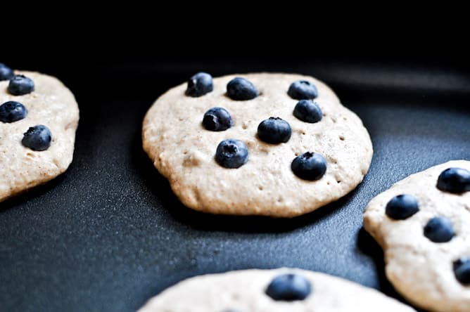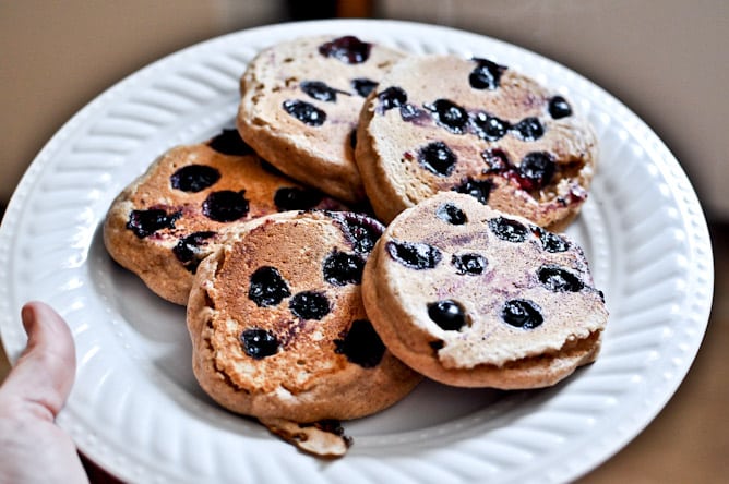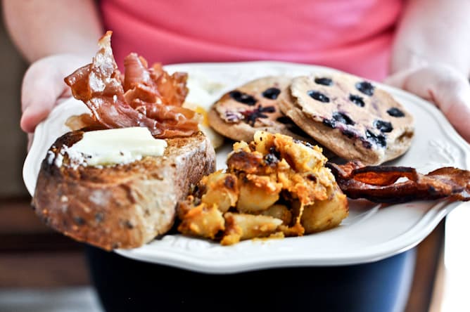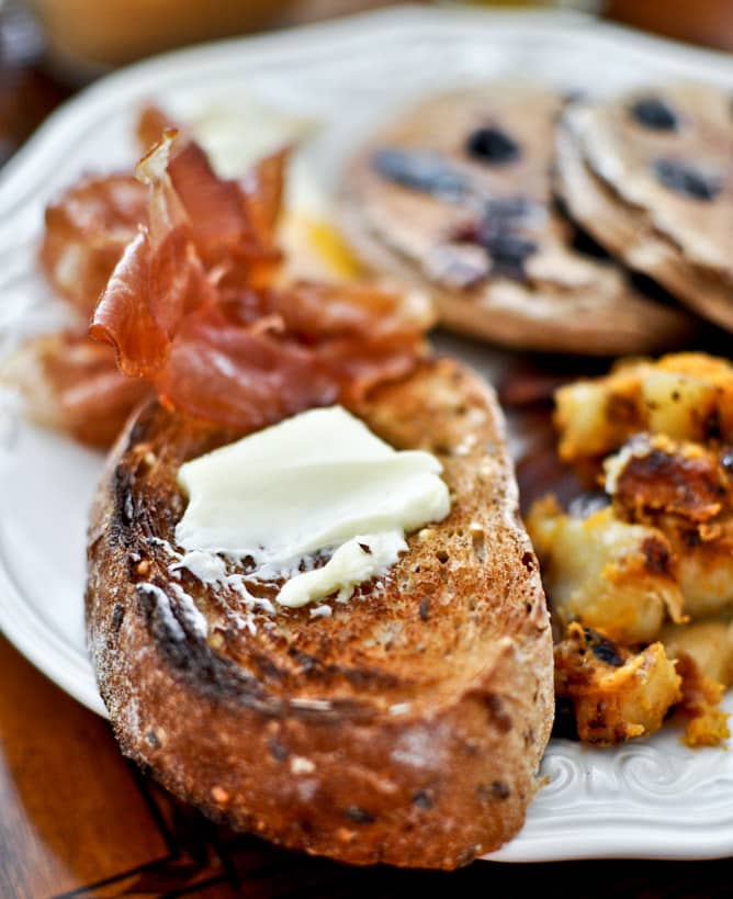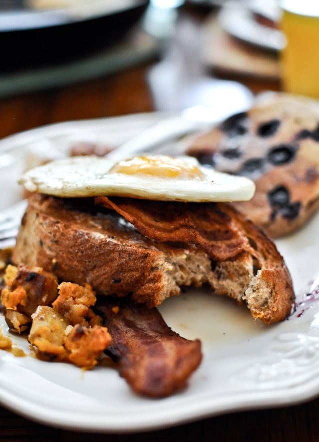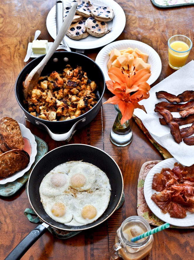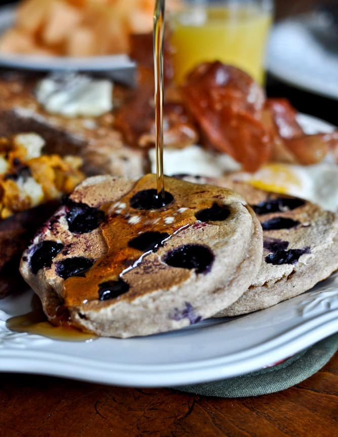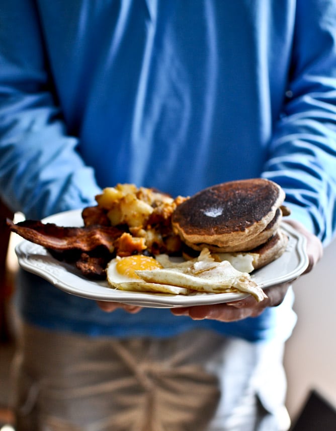 Less than 24 hours after returning from vacation and one rushed load of laundry later, my husband had to jet off for a work trip. I decided to surprise him with a big brunch when he got home yesterday afternoon, complete with whole wheat blueberry pancakes, bacon, toast, sweet potato hash browns, eggs cooked in bacon grease, cantaloupe, fried pancetta, warm syrup and orange juice.