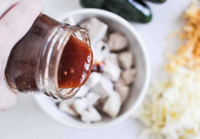 - Toss chicken with 1/2 cup of BBQ sauce and set aside.