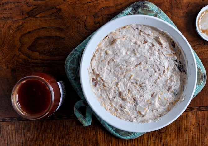 - In a casserole or baking dish (mine was 8-inch round, 4-inch deep), layer the cream cheese mixture, smoothing the top off. Cover it with the remaining BBQ sauce, then the remaining cheese. Bake for 20-25 minutes, until bubbly and hot. Serve with crackers or chips.