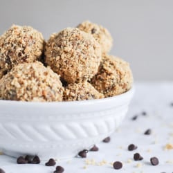 - Roll dough into golf-ball sized (or slightly smaller) balls, then roll in ground peanuts or ground almonds. These can be eaten at room temp but we really like them stored in the fridge!
