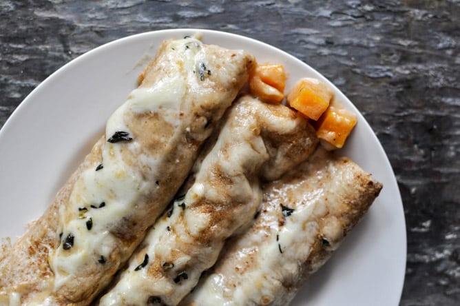 - In the small skillet, raise the heat to medium-high and add butter. Once sizzling add in the flour and whisk for 2-3 minutes until a golden, nutty roux forms. Pour in stock and milk, whisking again until bubbly and slightly thick. Reduce heat to low and stir in 1 cup of fontina, stirring until combined. Add in remaining nutmeg and taste to season with additional salt and pepper if desired. Spoon about 1/3 cup of sauce into the bottom of the baking dish, then spoon a few spoonfuls of the squash mixture in the center of each tortilla, rolling up tightly. Place all the rolled tortillas carefully into the dish, then cover with remaining sauce. Sprinkle with the rest of the cheese and some extra chopped sage. Bake for 20-25 minutes, until cheese is bubbly and melted. Serve immediately!