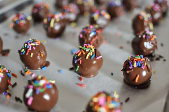 are those dipped oreo balls in the picture above?? I made them for my family and everyone of course LOVED them! They were so simple, however mine definitely did not look that pretty dipped – do you have any tips for the dipping part? What do you use to hold onto them while dipping? Thanks!!