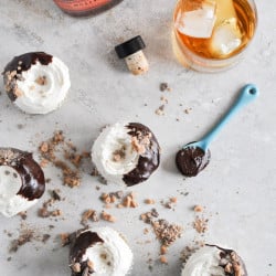 - Add chocolate to a large bowl. Heat heavy cream until just hot – when bubbles are appearing on the edges, then remove from heat and pour over chocolate. Stir constantly until the chocolate is melted and smooth. Once creamy, add in the bourbon, mixing again until smooth. Use however you’d like – dipping, drizzling, etc. I chose to dip about 1/3 of each cupcake top in the ganache before it firmed up, then topped it with some crushed toffee pieces.