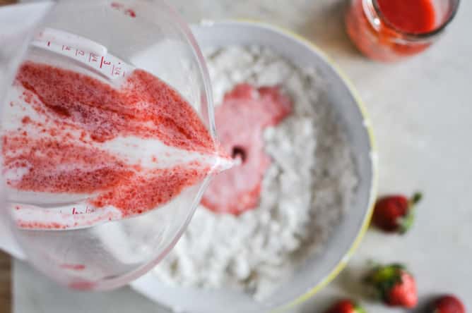 - In large bowl combine flour, sugar, salt, baking soda and powder. Using your fingers, a fork or a pastry blender, cut in butter until it forms coarse crumbs. Stir in coconut milk, 1/3 cup of strawberry puree and vanilla extract. Stir with a spoon until a dough forms, using your hands to bring it together. Turn onto a lightly floured surface and knead gently.