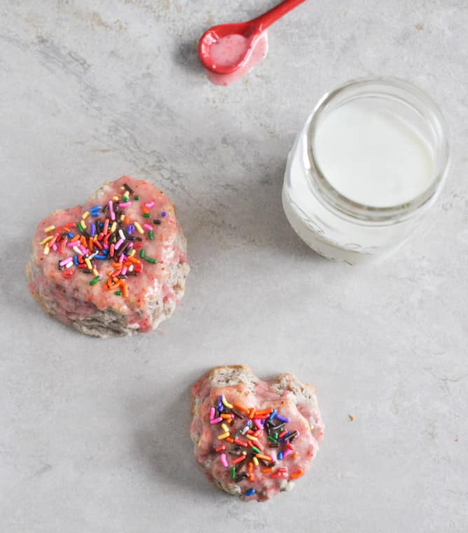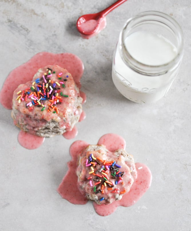 Just made these. O.M.G. These are like little strawberry frosted biscuits – much flakier and lighter than I think of a scone as being. We skipped the jimmies but did add the glaze, and wow, these are just damn good.
