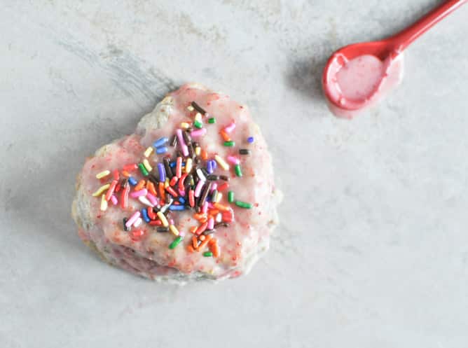 - Remove scones, let cool slightly, then drizzle on strawberry glaze and top with sprinkles.
