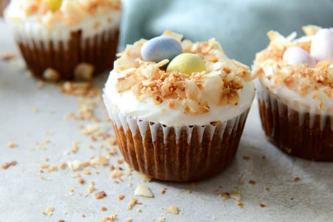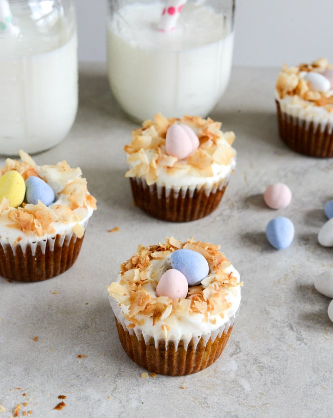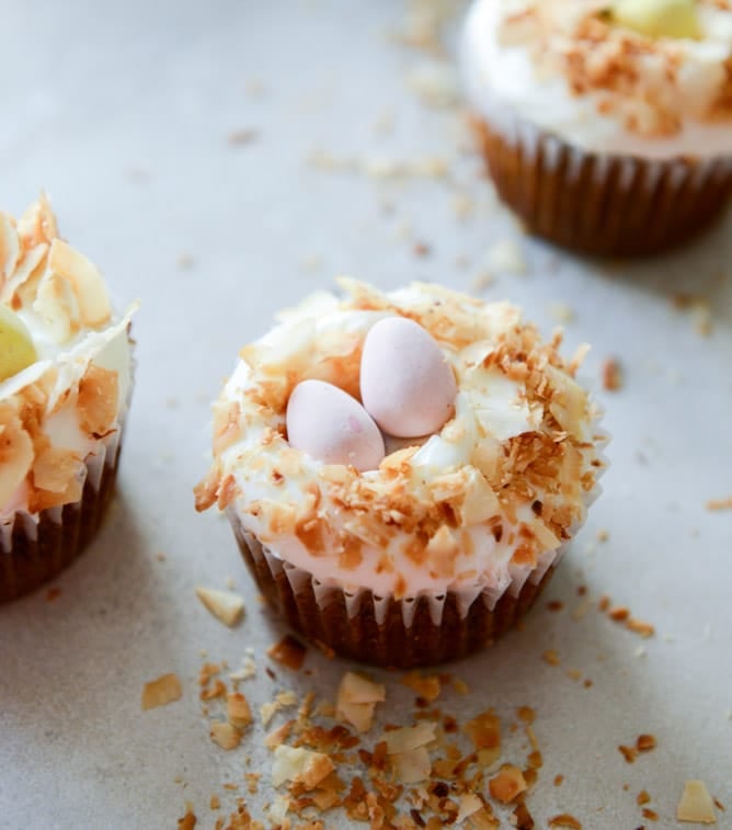 We left shredded coconut out of the cupcake itself, mostly because not everyone we were spending time with loooooves coconut like I do. How rude. If you’d like, you can throw a big old handful inside the batter, no other substitutions necessary. The frosting itself is flavored with coconut extract, but in my attempts to be crafty and entertain a small child, we put little nests on top with toasted coconut and Cadbury mini eggs.