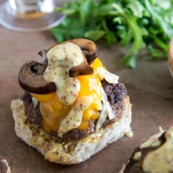 What we need to talk about today are these burgers. Holy smokes. I definitely stole the idea after eating a similar one a few weeks ago from a local food truck and it is by far my new favorite flavor combination. Double the cheese, perfect mushrooms, the mustard aioli I’ve been LOSING MY MIND OVER and arugula on top which makes it super fresh.