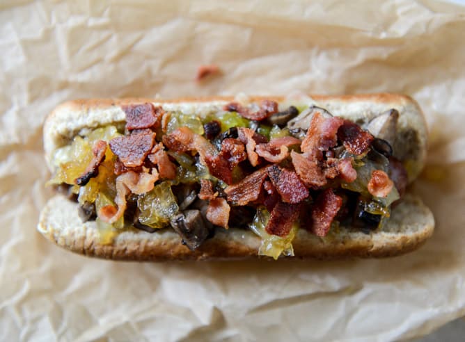 I understand that you may be freaking out over the amount of work that is now going into a simple party staple, but here’s the deal. 1. It’s totally worth it, for sure. 2. This can turn into even more fun – like a big bad hot dog bar. Not just ketchup anymore! Now you can make the mushrooms and onions ahead of time and set everything up beforehand, warming the ingredients if desired before people go crazy. and 3. you could actually assemble your hot dogs ahead of time, throwing on topping after topping then wrapping them in tightly in foil – almost like a cheesesteak (autocorrected to “cheesecake.” obviously.). To serve, throw them on the grill or in a warm over for a few minutes. It’s as simple as that and yeah… the only way I’ll eat a hot dog now. And I gotta admit, I’m a little partial to my own version over Five Guys.