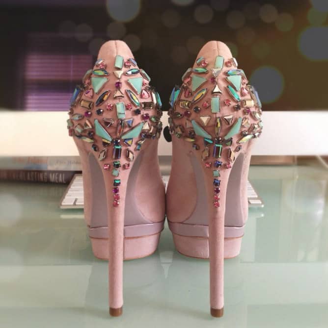 I recently bought a mint clutch from Coach that I LOVE because if I could pull it off, I’d wear care-bear-my-little-pony pastels head to toe…basically the color of those shoes and gems!