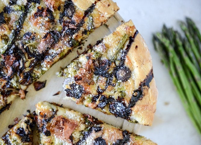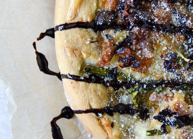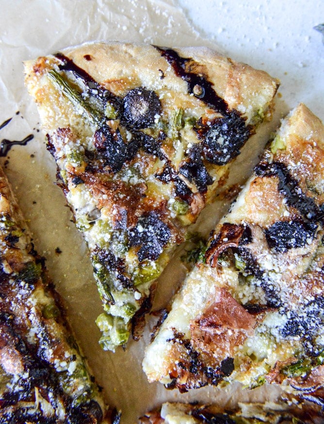 What I think I love most about this pizza, however – besides the balsamic glaze – is that the asparagus spears get a bit crispy too. You know I like to roast the heck out of my vegetables, like roast until they are near death, and if you put super skinny spears on your pizza, they will roast perfectly. And if all this jazz isn’t your thing, I made asparagus pizzas last year with bacon and eggs that were, um… pretty darn good. I might make one tonight. Darn, it feels like I just made those yesterday. SLOW DOWN TIME.
