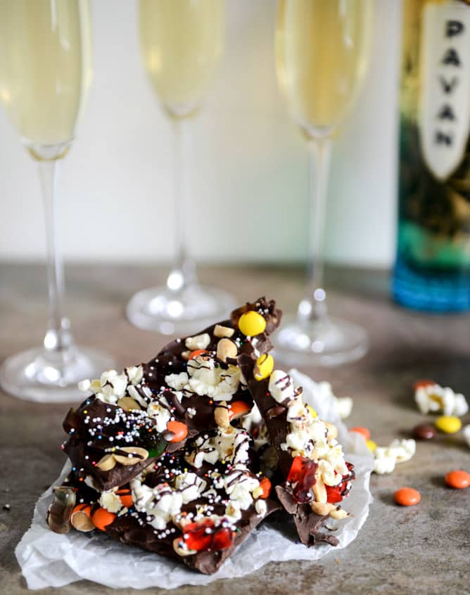 This is my final fun, snacky movie-inspired recipe I’m sharing to pair with Pavan Liqueur and later this week, we’ll be going to the Nantucket film festival together to share cocktails and snacks. Seriously cannot wait. [Fair warning: I might instagram my face off.] And I paired this candy chocolate hybrid with one of their signature champagne-like cocktails: Pavan, prosecco and a lemon wedge – what a treat. Perfectly simple because who doesn’t love chocolate and bubbles?