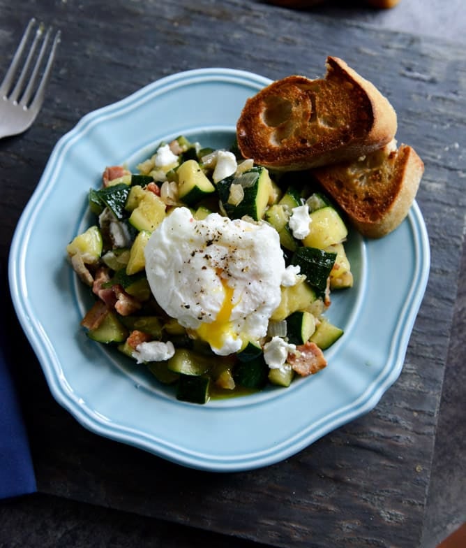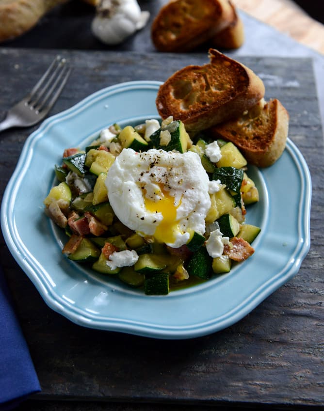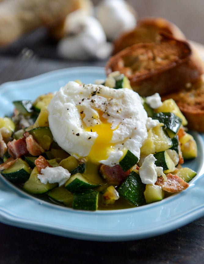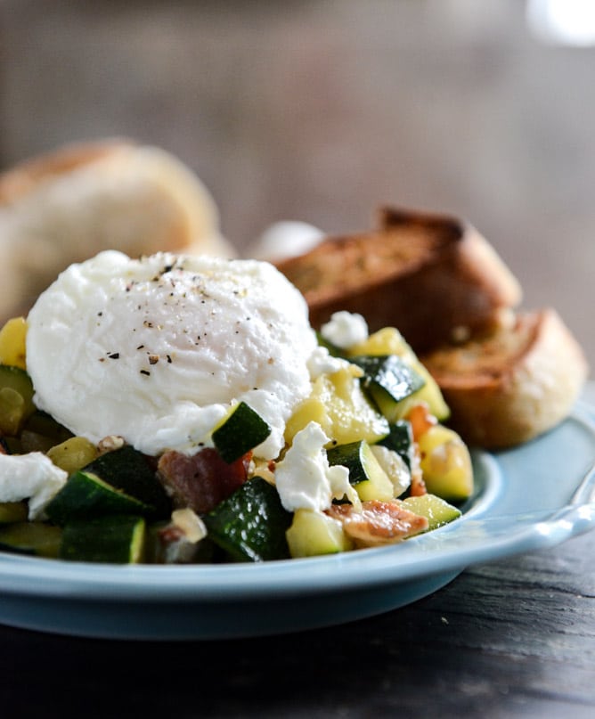 Zucchini Summer Skillet with Poached Eggs + Garlic Butter Baguettes