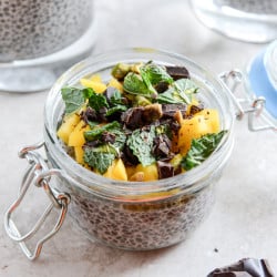 - When you’re ready to eat the pudding, spoon it into 4 or 6 glasses or jars of your choice. Cover the top with mango, a sprinkle of dark chocolate, a sprinkle of pistachios and fresh mint. Drizzle with a bit of honey and eat.