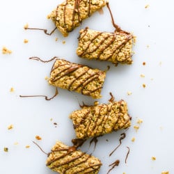 - In a saucepan, combine the butter, coconut oil, honey and vanilla bean paste. Heat over low heat until the butter and oil melts, stirring the mixture together. Pour the butter mixture over the dry ingredients, stirring well until the entire thing is moistened. You don’t want any dry oat parts. Press the mixture in the greased dish and smooth the top with the back of a spoon. Bake for 18 minutes, or until the top is slightly golden and the bars are set. Allow to cool completely before slicing into bars. You can drizzle the chocolate on top before or after cutting – you can also dip them.