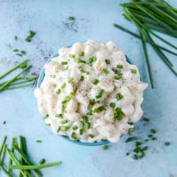 - Immediately stir in the cooked pasta shells. Stir to coat completely. Serve right away – topping with chives for some color if you’d like. I like to top the shells with the mushrooms, but you can also stir them right in!