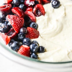 - Place the cherries, blueberries and strawberries in a large bowl. Toss with the 2 tablespoons flour. Use a spatula to fold the berries and cherries into the cake batter.