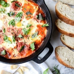 I’m a longtime fan of baked eggs – this version is the reason that I put a blog recipe in my cookbook! – and now, I’m a super new fan of eggs baked in tomato sauce. If one for one reason: tons.of.bread. The dippage situation right here is just that: a situation. A fantastic situation. So much dipping! I also love the runny yolk because it’s a bit light and creamy in the tangy sauce. And then there are some red peppers.