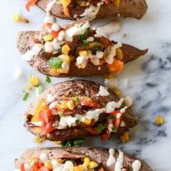 54 Comments on “Veggie Fajita Stuffed Sweet Potatoes with a Chipotle Drizzle.”