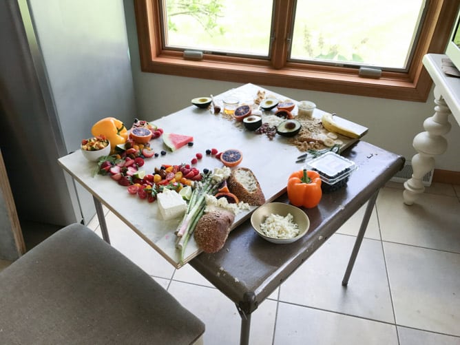 if the fresh food wasn’t sliced, i obvi saved all that (or we ate it as soon as we were done) – sliced citrus can be saved but things like avocado or plums or berries that have been sliced and sitting out for 10 hours… not really. it just depends! the last shoot i ended up spritzing a lot with olive oil so we lost some of that towards the end.