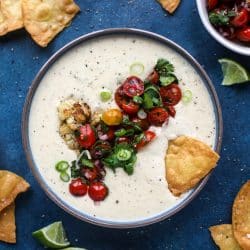The husband and I will be preparing this queso for our Super Bowl party. We’re not really fans of football, except when Tom Brady is playing. We just adore Tom Brady. Anyhow, I’m thinking of preparing per your instructions and then place it into a small slow cooker set to low to keep warm and to not thicken. We have the ‘boys club’ coming over and will let you know what they think, but I’m saying everyone is going to love this. Queso with roasted cauliflower, get out girl. (Love the pic with queso topped with cherry tomatoes and cilantro. Fantastic color in that picture).