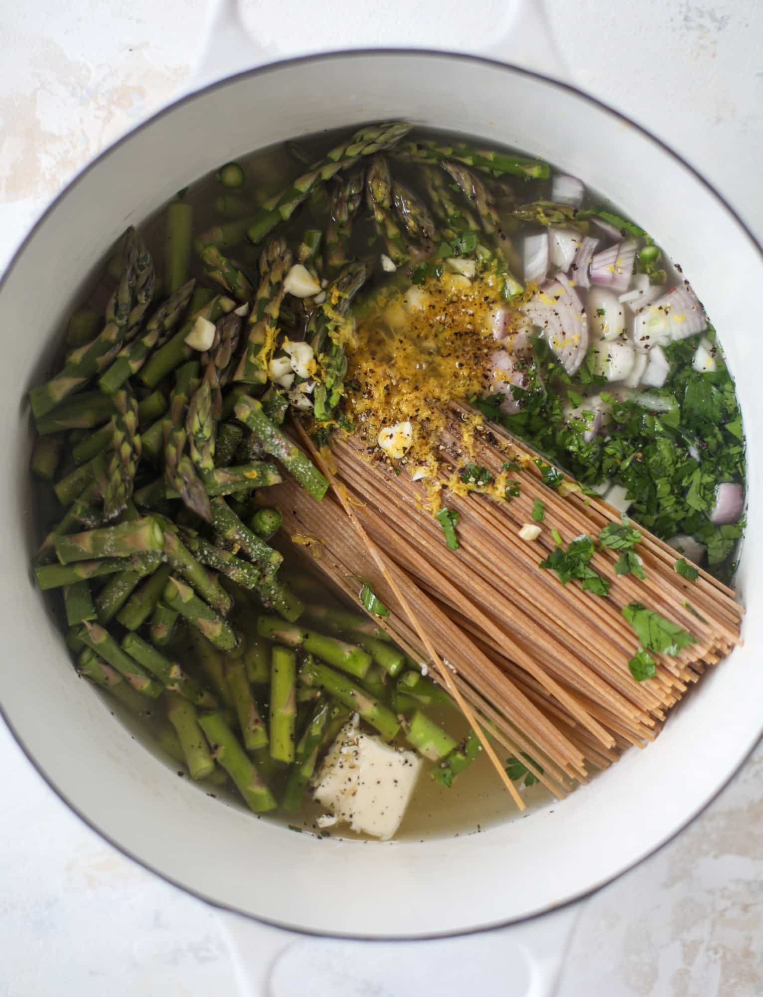 - Place the asparagus, pasta, garlic, shallot, lemon juice and zest, water, stock, parsley, butter, salt and pepper in a large stock pot. Bring the mixture to a boil and cook for 10 to 12 minutes, stirring occasionally to make sure the pasta doesn’t stick to the bottom of the pot.