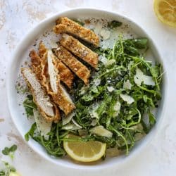 Love the simplicity of this. Reminds me of a lighter version of the Romano chicken in your first cookbook which we LOVE! I will have to sub a different lettuce since I’m the only person in the world that finds arugula bitter, not peppery! Thank you for another delicious idea!