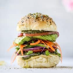 - To assemble the sandwiches, spread the hummus on the bottom layers of the buns and top it with the pesto. Add on the Havarti slices, then layer on the tomato, cucumber, shaved carrot and avocado with sprinkles of salt and pepper as you go. You can add a little more pesto on top if you’d like too!If you'd like to make sure your veggies are super thin, you can use a mandolin to slice them. It totally depends on your preference of how thick you like the vegetables. I like them very thin!