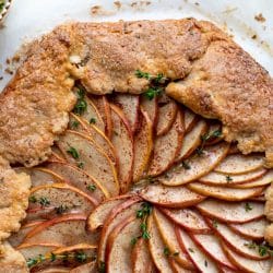 But! My favorite part of this whole thing might be the thyme butter. Brush just a touch of it on the apples once the whole thing comes out of the oven and you will be in heaven. It’s so decadent and buttery and indulgent and delicious. While still being a slightly lighter fruit dessert!