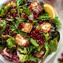 It’s the best starter salad EVER. Full of incredibly flavorful ingredients. Like salted honey roasted walnuts, pomegranate arils, halloumi croutons and spiced orange vinaigrette.