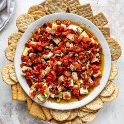 I’ve seen my friend Molly share on instagram that she makes this for parties, and I’ve always been intrigued. I’m a sucker for marinating things like beans and having them in the fridge for meals during the week. So, obviously, the idea of marinating CHEESE is right up my alley.