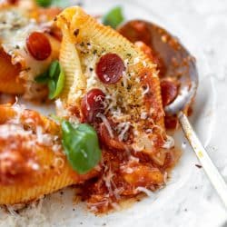 Enter: PIZZA STUFFED SHELLS!! Oh my word. All the flavor of cheesy pizza stuffed into pasta shells and covered with pepperoni. And more cheese. Because of course.