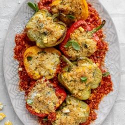 These bell peppers are stuffed to the brim with a summery parmesan and vegetable risotto then showered with crispy, crunchy breadcrumbs. Then baked until warm and cheesy and wonderful.