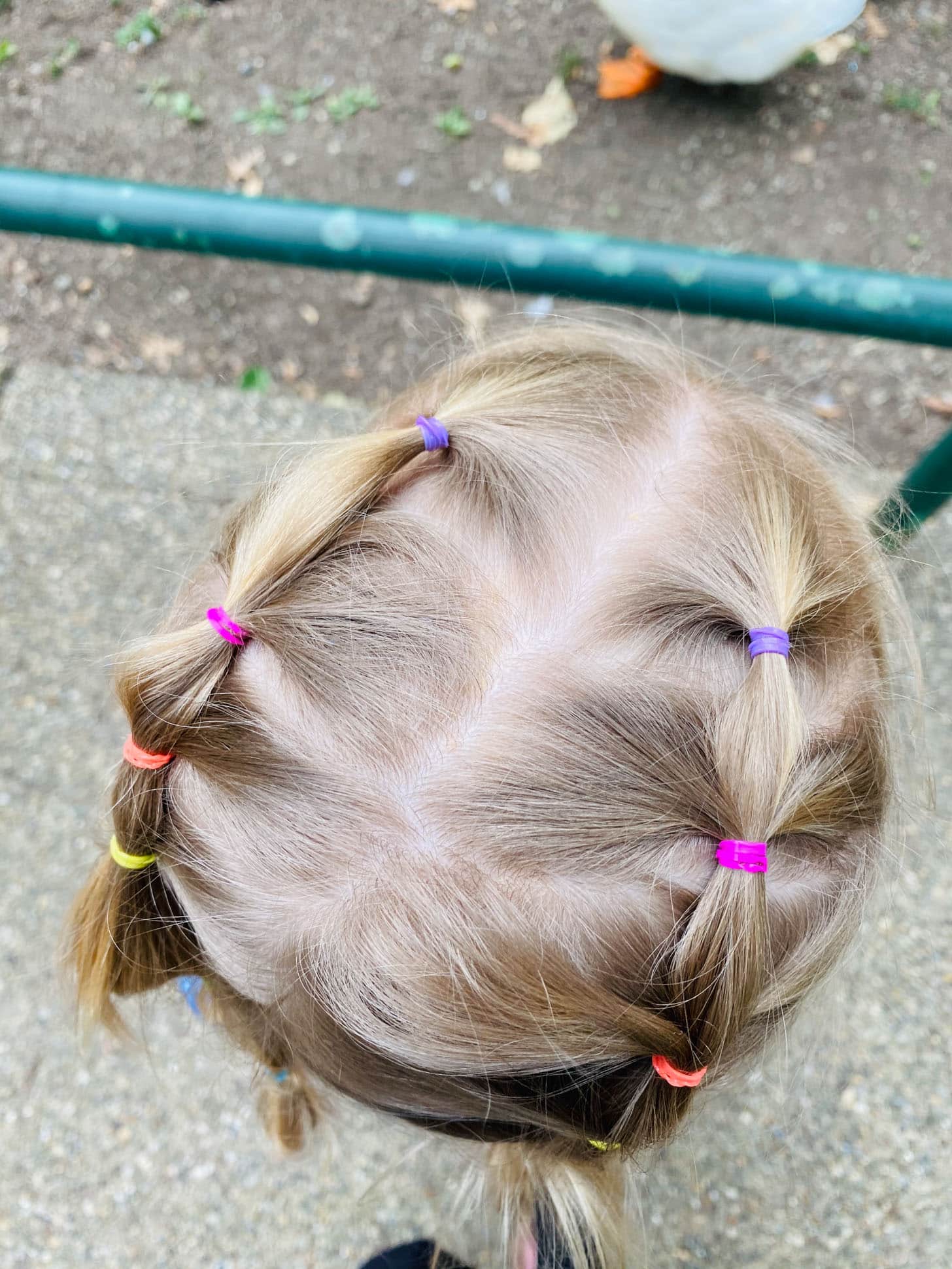 And this hair. Didn’t really think about how tricky it would be to take out at 9PM after a day of wild playing and exhaustion.
