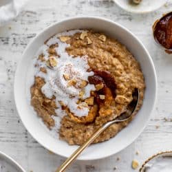 This oatmeal doesn’t use pumpkin puree, it uses pumpkin butter! Which is great news if you can’t find pumpkin puree. I also use pumpkin butter in my gooey pumpkin bars, so don’t worry about buying a jar and not using it up.