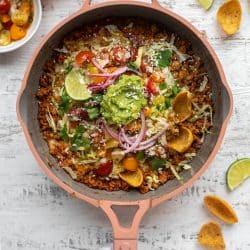 - Sprinkle the cheddar cheese on top. You can let it melt for a few minutes or even cover the skillet so it melts quicker. Top with the lettuce and pickled onions. Top with the quick pico and guac. Top with cotija cheese if you'd like. Serve with tortilla chips!