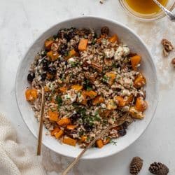 I love grain bowls and this was no different! Simple to put together and delicious. I didn’t have cranberry juice so I omitted it and reduced the olive oil for the dressing. Altogether delicious and going to be a fall / winter lunch staple!