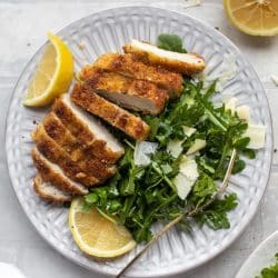 Much like the crispy parmesan chicken recipe I mentioned above, I like to serve this with some lemon arugula topped with parmesan. It’s such a simple salad but one that is refreshing, crisp and has a bit of a peppery bite from the arugula. It complements the pork so well too.