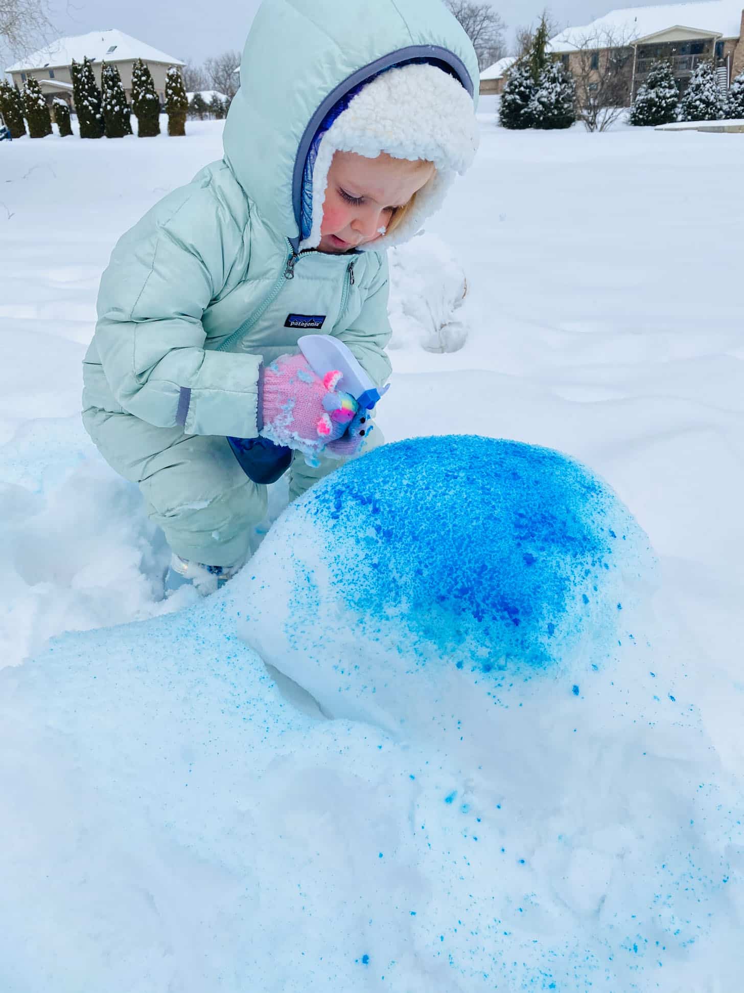 She continued to love the snow once Max went back to school. This is water with a drop of food coloring in a spray bottle. Super fun!