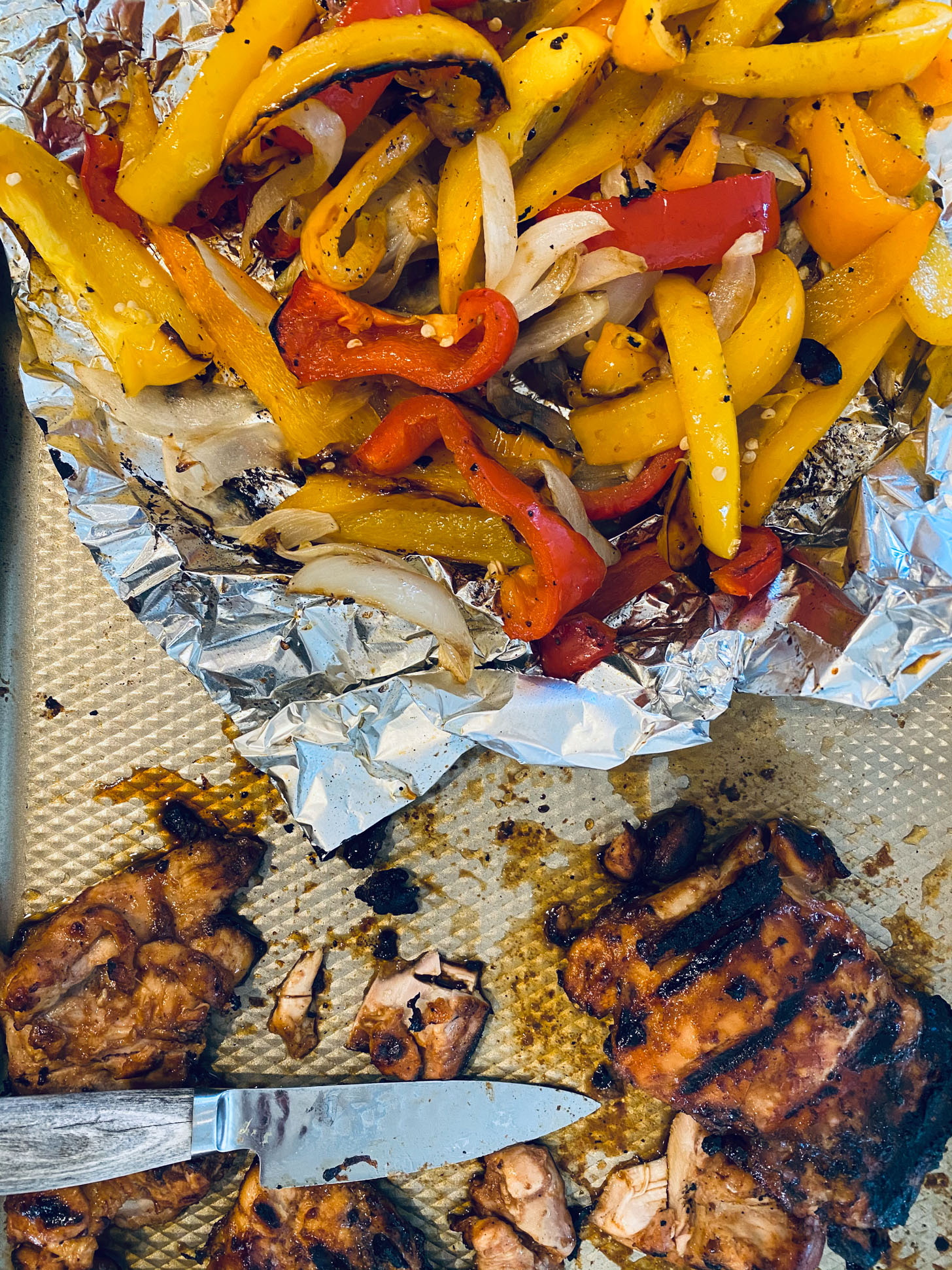 Chicken and grilled peppers for dinner one night that was then repurposed into quesadillas!