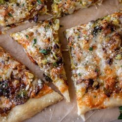 This pizza has everything. It has sweet and savory flavor from the caramelized onions, tons of cheese, flavor and a slight chew from the shredded brussels and of course, the pistachios! Every bite is loaded which is the best kind to make. Each bite has flavor, texture and cheesy goodness.