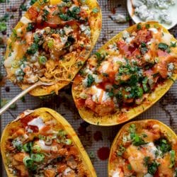 What I love about this squash is that it’s such a great weeknight meal. So filling and satisfying. In a pinch you could use rotisserie chicken and if you want to make it more bar-food like, use frozen popcorn chicken that is extra crispy, tossed in sauce.