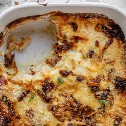 I like to use gruyere cheese here because it’s the classic flavor of french onion soup. I throw some in the cheese sauce and some in between the layers, along with the caramelized onions. Top the entire thing off with crunchy breadcrumbs, bake until it’s melting together and the potatoes and super soft.