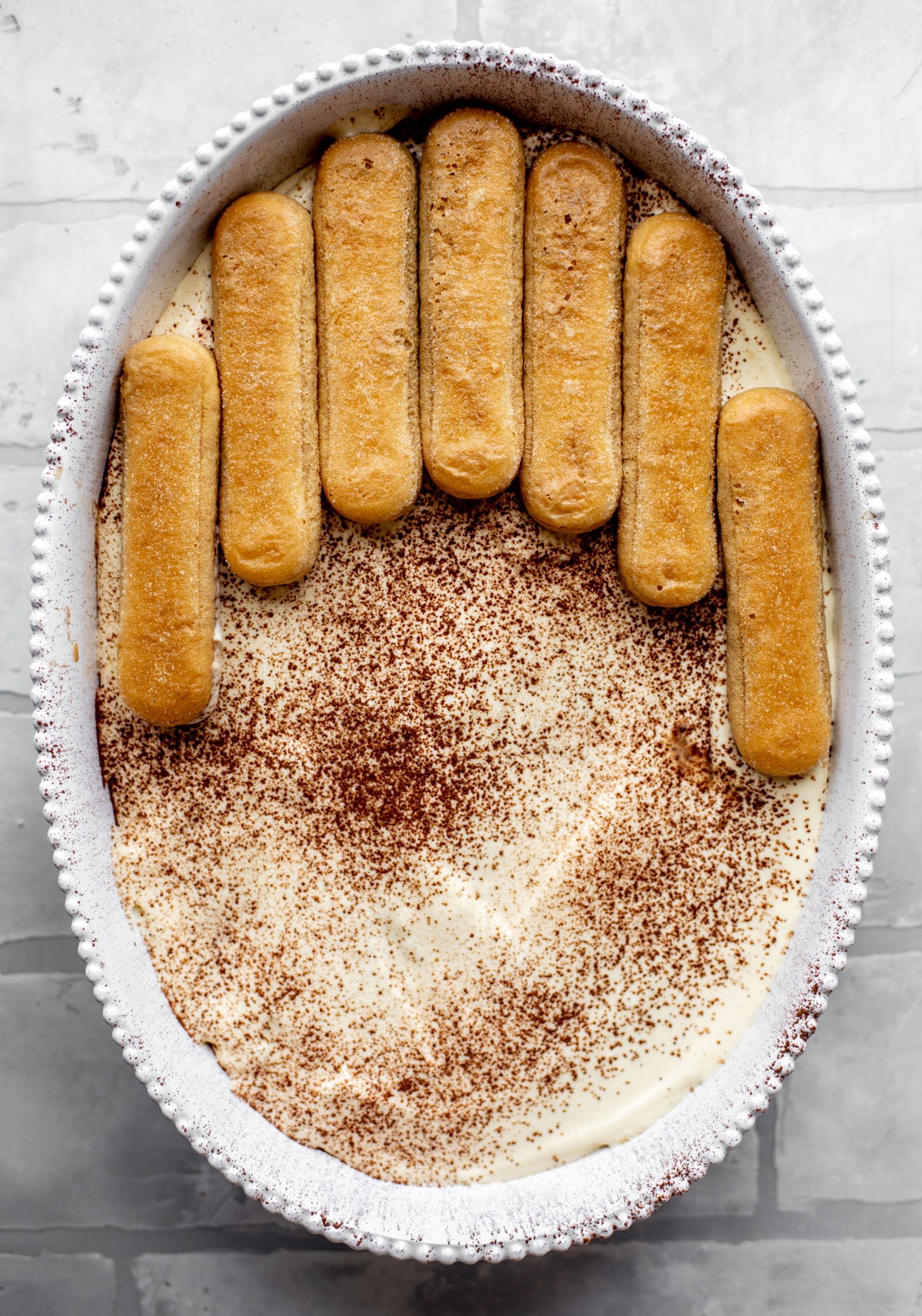 - Take each ladyfinger and dip it in the espresso/irish cream until soaked through. Don’t oversoak, as the ladyfingers will fall apart. When I do this, I dip a ladyfinger, count to 3, and then flip it and count to 3 again. Place the ladyfinger in the dish and repeat with more ladyfingers, until you have a single layer of the soaked ladyfingers.
