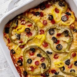 I find it funny that I like to make “pizza supreme” flavored dishes because for most of my life, if I was ever served a pizza supreme, I would run away!! If you’re not familiar, the idea of pizza supreme means that it’s loaded with alllll the toppings. Well, most of them. Peppers, mushrooms, pepperoni, sausage, olives, etc.