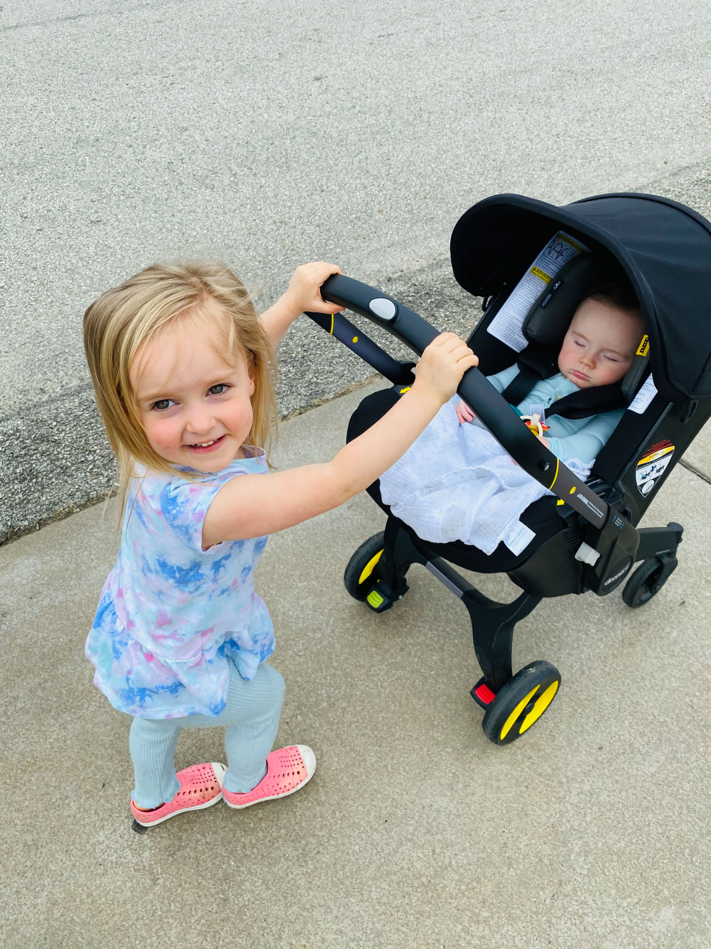Emilia pushing baby Cooper while we worked earlier this week! This convinced me that I need the Doona, haha.